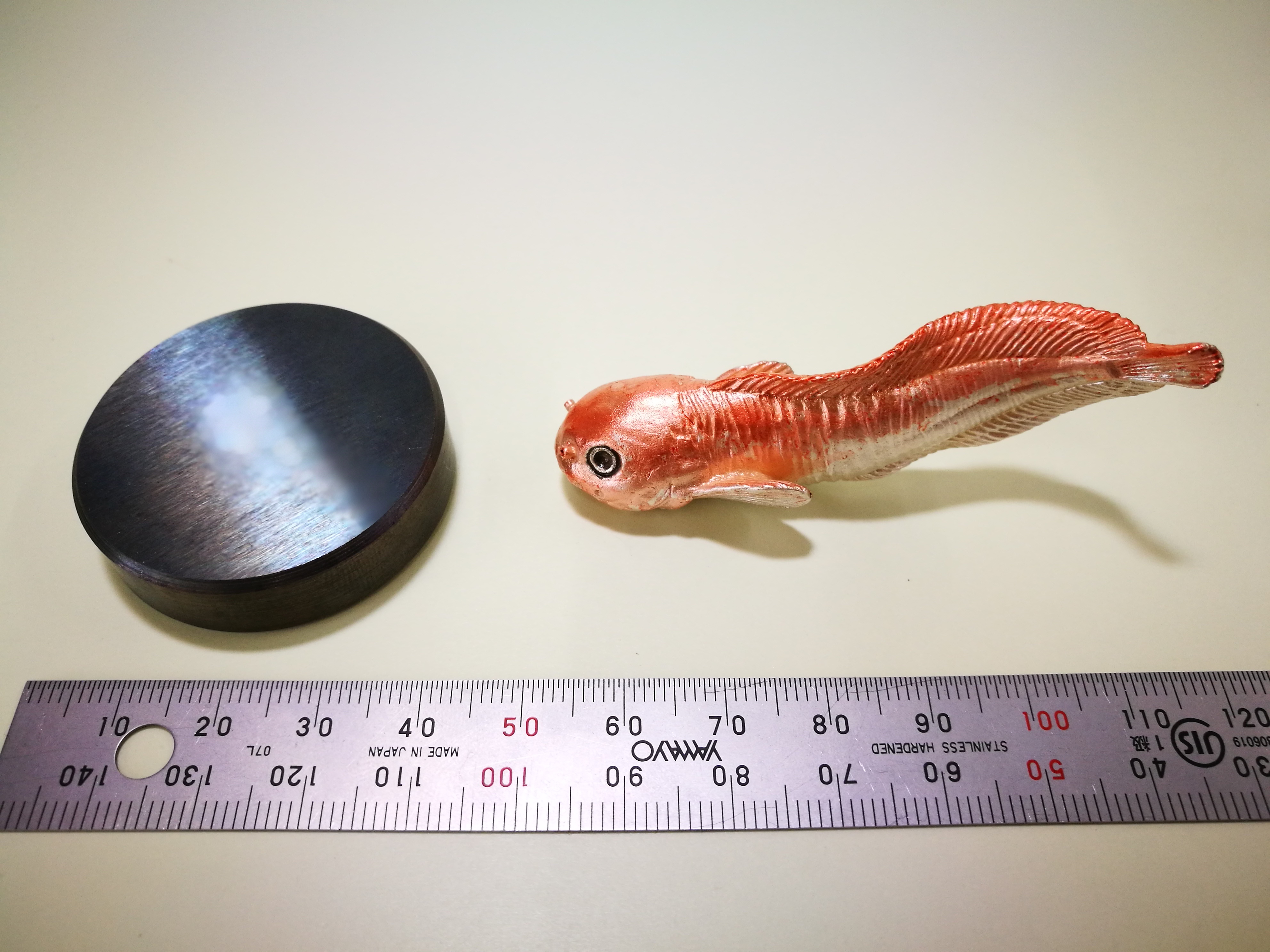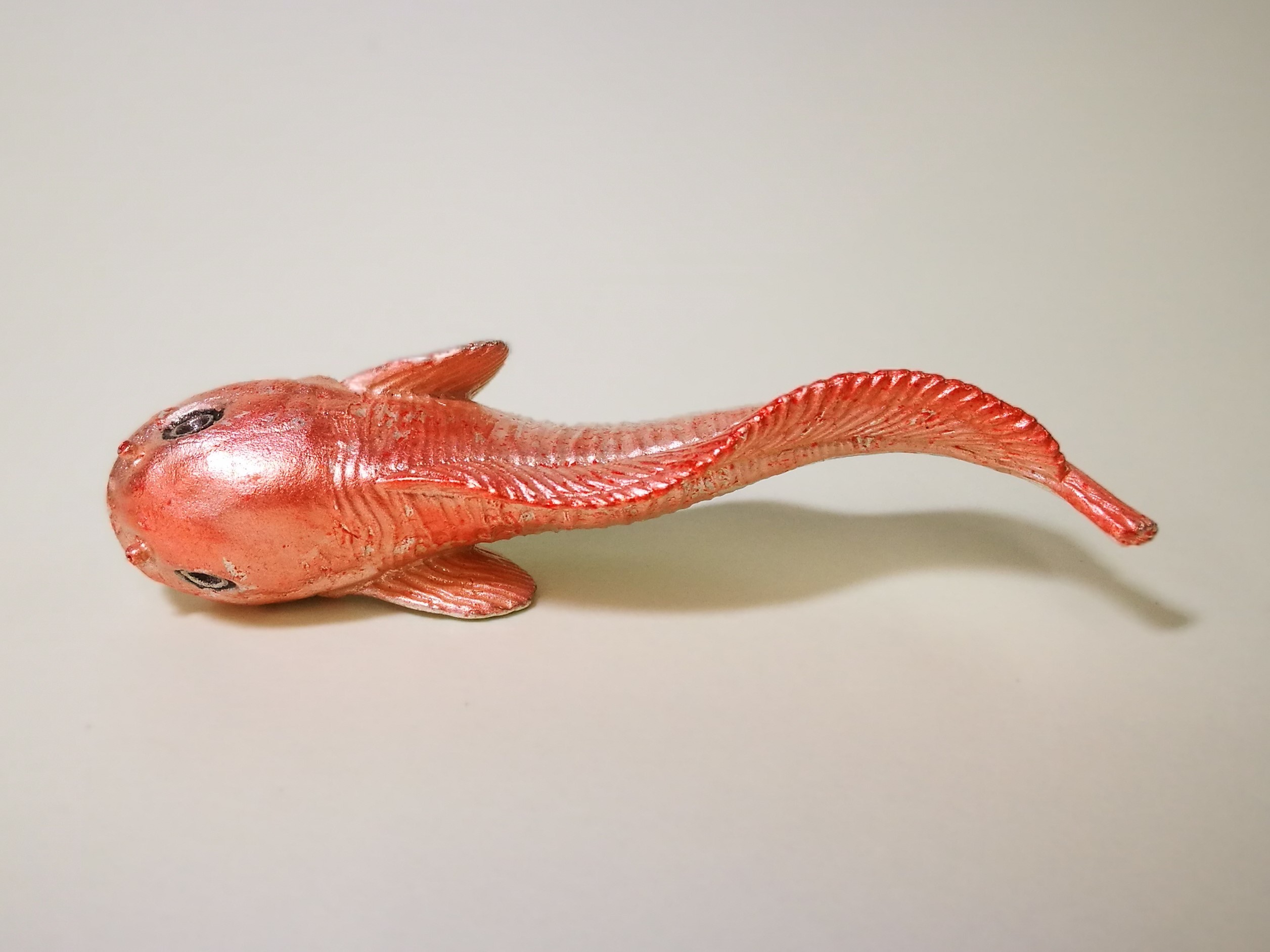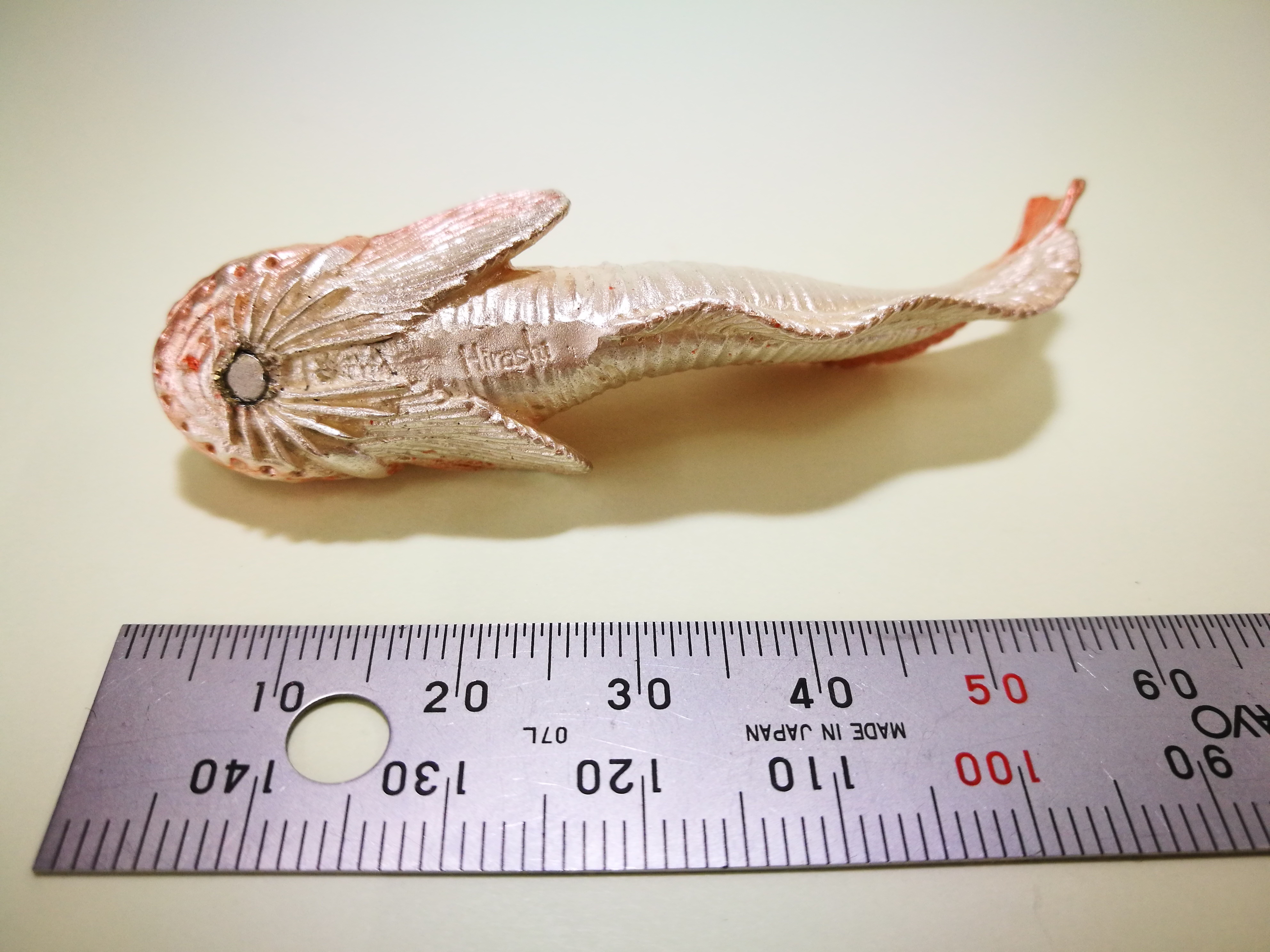 2019年7月、日本橋三越のステーショナリーで個展「平島鉄也いきもの図鑑」がありました。展覧会では可能な限り在場してお客さまとお話しますが、この展覧会では「デモンストレーションを」とのことで、会場でWAX原型作りをしていました。そのとき作り始めたのがこのヒメコンニャクウオ。深海生物にはもともと興味があって同年同じく深海生物メンダコのオブジェを完成させたばかりでした。原型づくりの資料として深海生物の本を持参。理想としてはその動物のいろんなアングルの写真が欲しいのですが、展覧会まえのバタバタの中で用意できませんでした。深海生物の本も、作品制作用の資料として作られたモノではありません。デモンストレーションで制作する生き物は、本の中から、全身が写っているか、制作に耐えうるディティールまで見えているか、作りたくなるような魅力的な生き物であるかといったハードルを越えた生き物、ヒメコンニャクウオが選ばれました。会場ではハードワックスと呼ばれる彫刻のできる蝋に、歯医者さんが使うようなスパチュラ(へら)で彫刻してゆきます。原型制作には時間をかけるタイプなので、デモンストレーション中にはもちろん完成しませんでしたが、展覧会後に完成までなんとかこぎつけました。ヒメコンニャクウオという生き物にはおなかに吸盤あるそうです。吸盤に磁石を埋め込み表現したことで、緊張感のある姿勢で自立できています。また、この作品では初めて「エレカラ」という着色をしています。メッキに近いような技法です。真鍮で鋳造したモノを工房で銀メッキをかけた後、エレカラ着色しました。目は古び液で黒くしています。